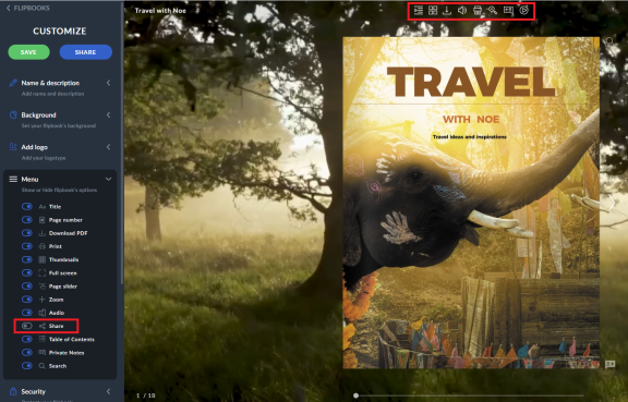 L’icône de partage sera supprimée de la barre supérieure, et le partage de votre flipbook ne sera plus possible.